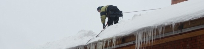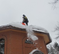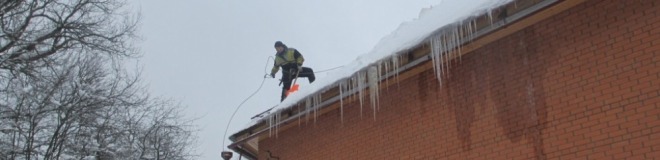 Очистка кровли коттеджа от снега проводилась в конце цимы 2013 года где-то в Подмосковье. Для предотвращения протечек с крыши, порчи кровли и прочих проблем нужно вовремя вызывать промышленных альпинистов для очистки крыши от снега, наледи и сосулек. В том случае, конечно, если самостоятельно на крышу залезать и чистить небезопасно.