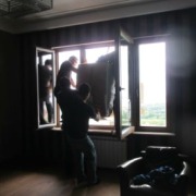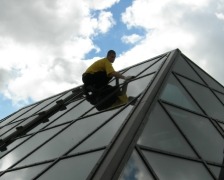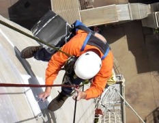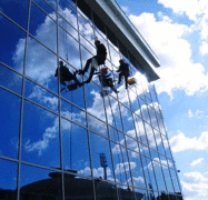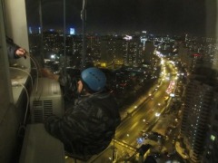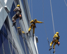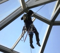 Услуги альпинистов в строительстве: замена треснувших стёкол в фасадном остеклении высотного здания